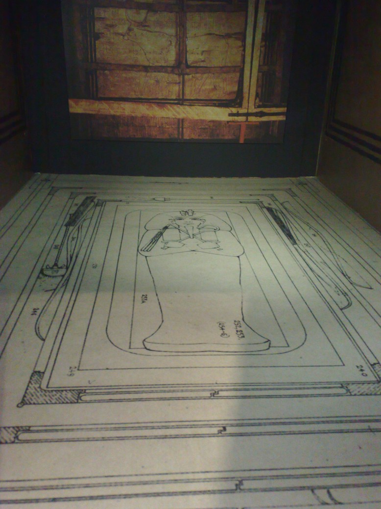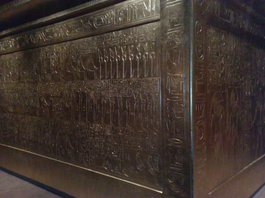Rovněž i třetí schrána je pojata jako hornoegyptská posvátná kaple. Obě její vnější stěny obsahují výjevy z knihy Amduat, jejíž název lze přeložit jako „To, co je v podsvětí“. Jedná se o pohřební text, který byl vyhrazen pouze pro krále a líčí noční pouť slunce. Každý úsek popisuje jednu z dvanácti nočních hodin a s výjimkou první hodiny je rozdělen do tří částí. V prostřední část každého z obrazů nalezneme bárku slunečního boha (v jeho noční podobě s beraní hlavou). Výjevy z Amduatu se objevují již na stěnách královských hrobek Tutanchamonových předků. Ve srovnání s verzemi známými z jiných hrobek jsou však obrazy z Knihy o podsvětí na třetí schráně Tutanchamonova sarkofágu zhruba o třetinu kratší.